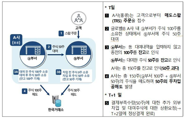 BNP파리바와 HSBC는 각각 다른 방법으로 이런 거래를 진행하였다. BNP파리바는 내부 부서 간 주식 대차 내역을 시스템에 입력하지 않아 실제 소유주보다 많은 잔고로 매도주문을 내는 수법인 반면, HSBC는 TRS(Total Return Swap) 주문과 관련하여 차입 가능한 수량 기준으로 예비적인 주문 제출 등 본인들만의 독특한 방식으로 위조 거래를 진행하였습니다.